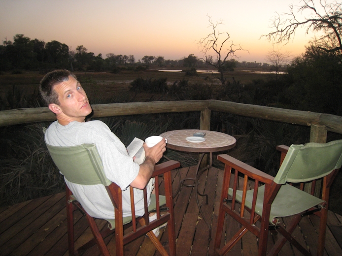 A typical morning: have some coffee (hot water lasts all night in a big metal thermos) and look out at the water birds and red lechwe we could see from our porch in Xigera.