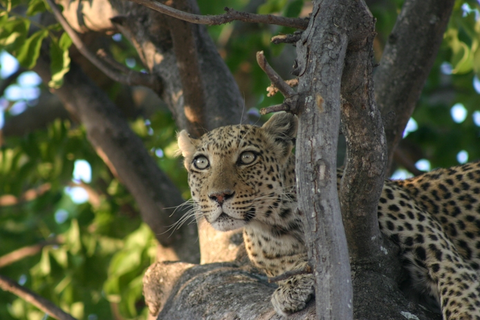 | ...like this one, of a leopard at maybe fifteen feet. He's just waking up from a nap, and - as the sun went down on our first day in Bostwana - he would walk right up to our car, take a look, decide against any further interaction with us, and head out for the night's hunt. | |